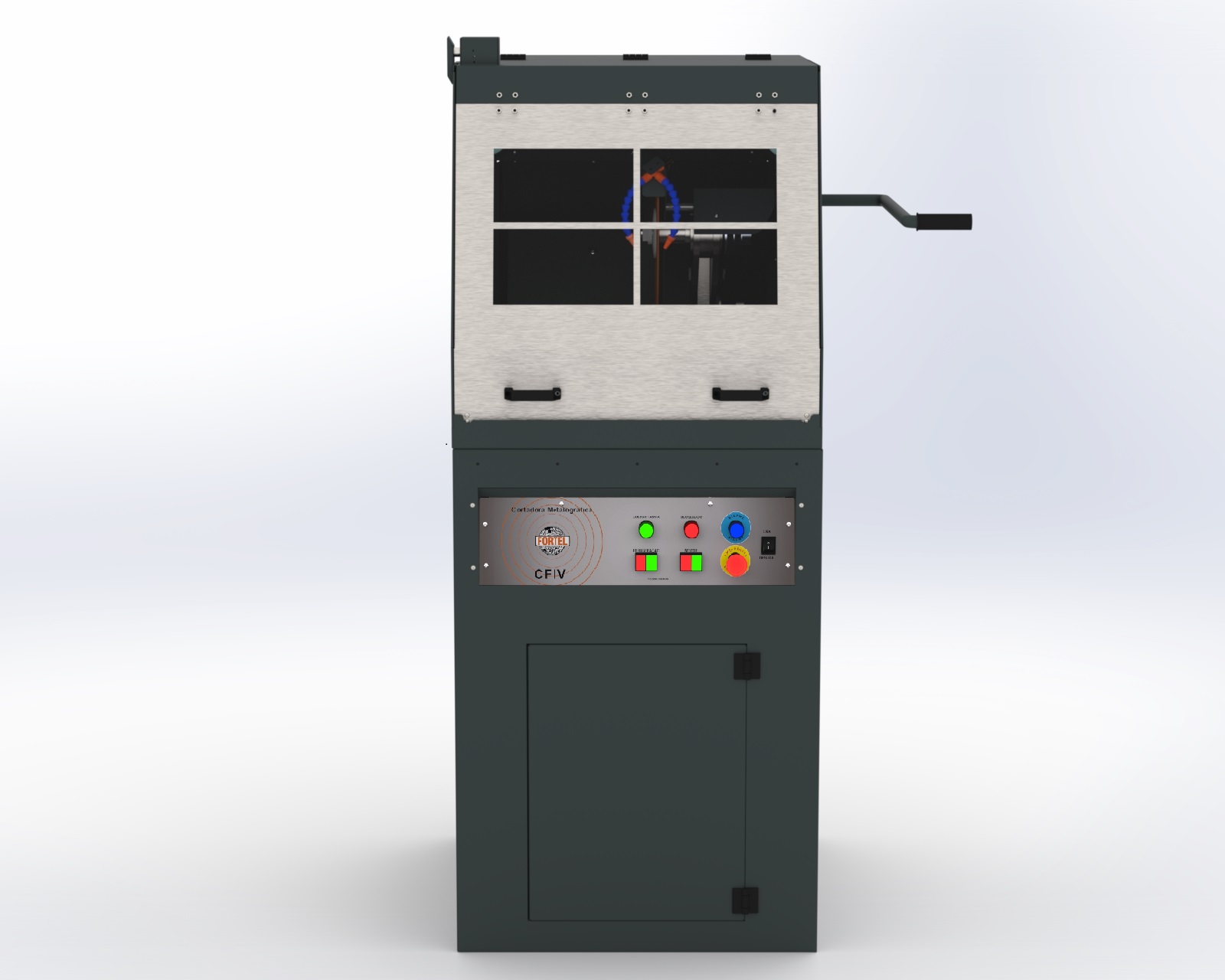 O equipamento possui botões independentes para bomba de refrigeração e para o acionamento do motor (corte). Tampa de fechamento com sistemas de segurança que impedem a abertura da máquina ocorra com disco de corte em movimento, a abertura da tampa será liberada somente quando o disco estiver parado, conforme norma NR12.