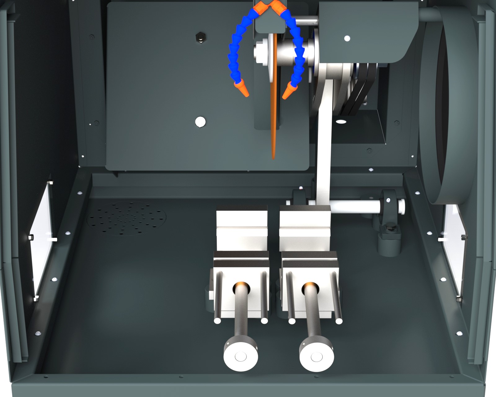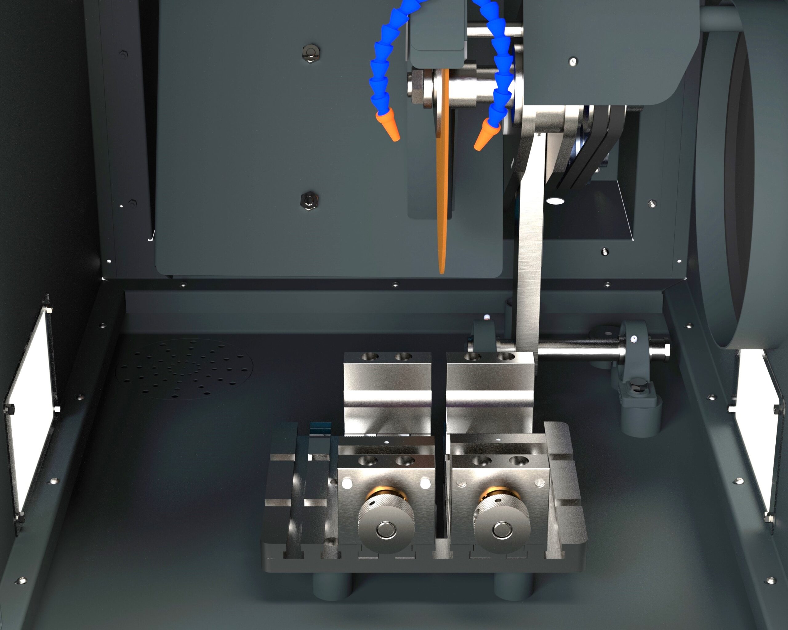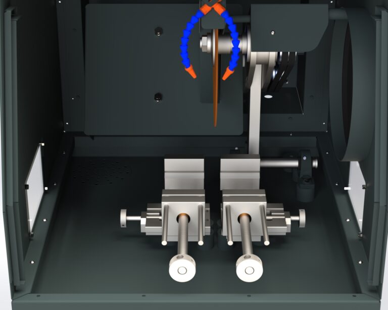 Sistema de refrigeração/ lubrificação com regulagem de fluxo de vazão, fixados na flange de proteção do disco. O conjunto acompanha o movimento do disco durante o corte, garantindo a aplicação contínua e eficiente do fluido sobre a amostra..
