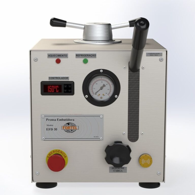 Prensa embutidora manual para embutimento de amostras metalográficas com resina fenólica (baquelite) termoplástica ou resina acrílica com 30 mm de diâmetro e altura de 30 mm;